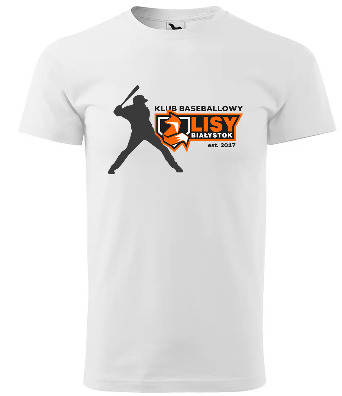 Koszulka T-shirt biała z nadrukiem logo Klubu baseballowego Lisy Białytok + ikona baseballisty.